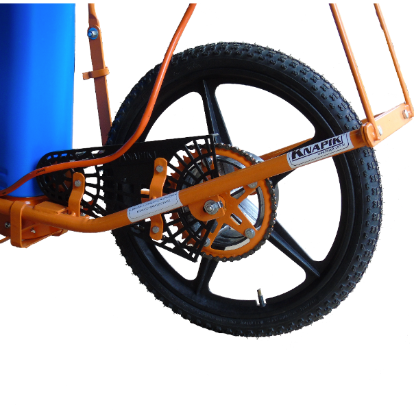La cuve est posée sur une système de brouette en acier, la roue de cette dernière entraîne un mécanisme qui actionne la pompe! Le débit et la pression est réglable très simplement.