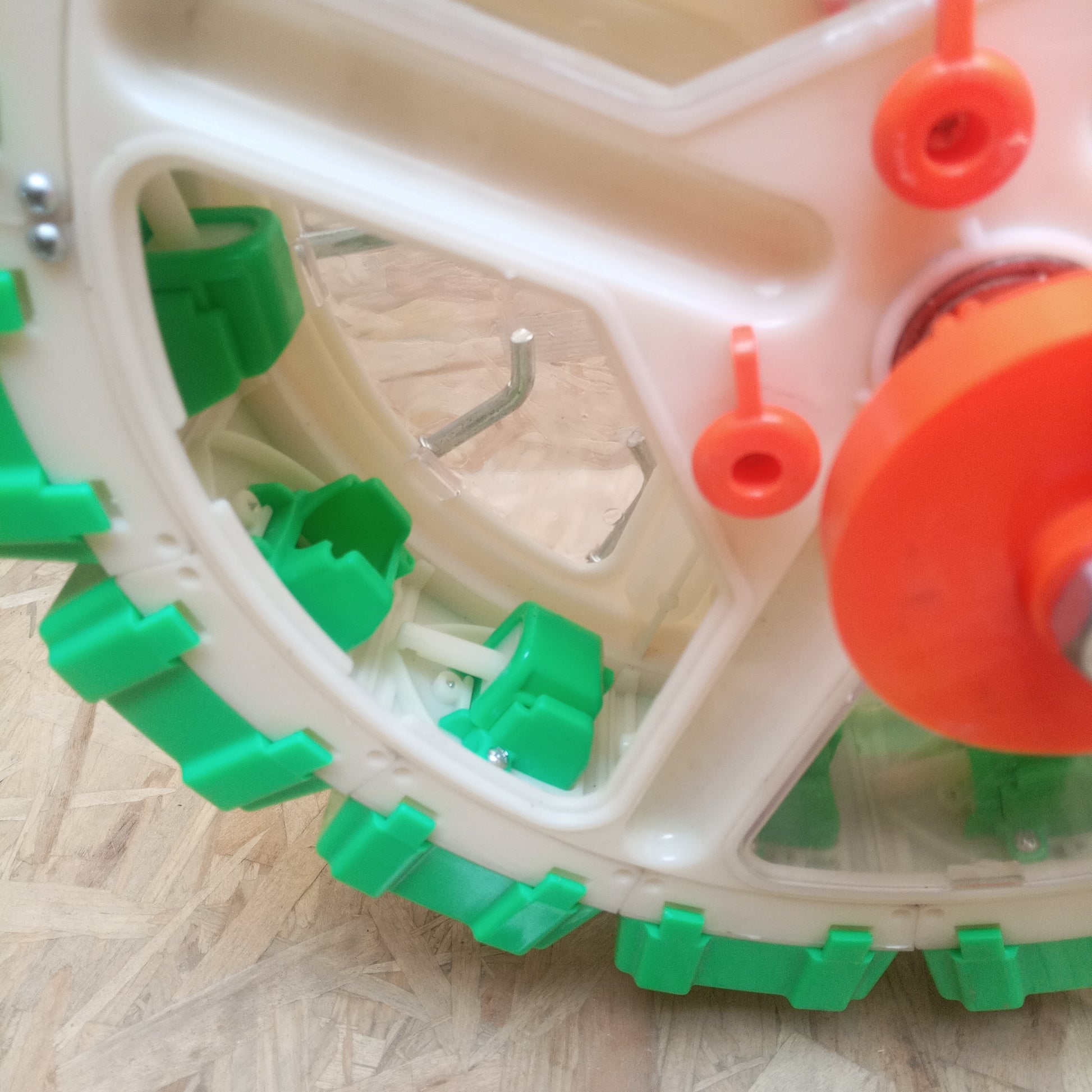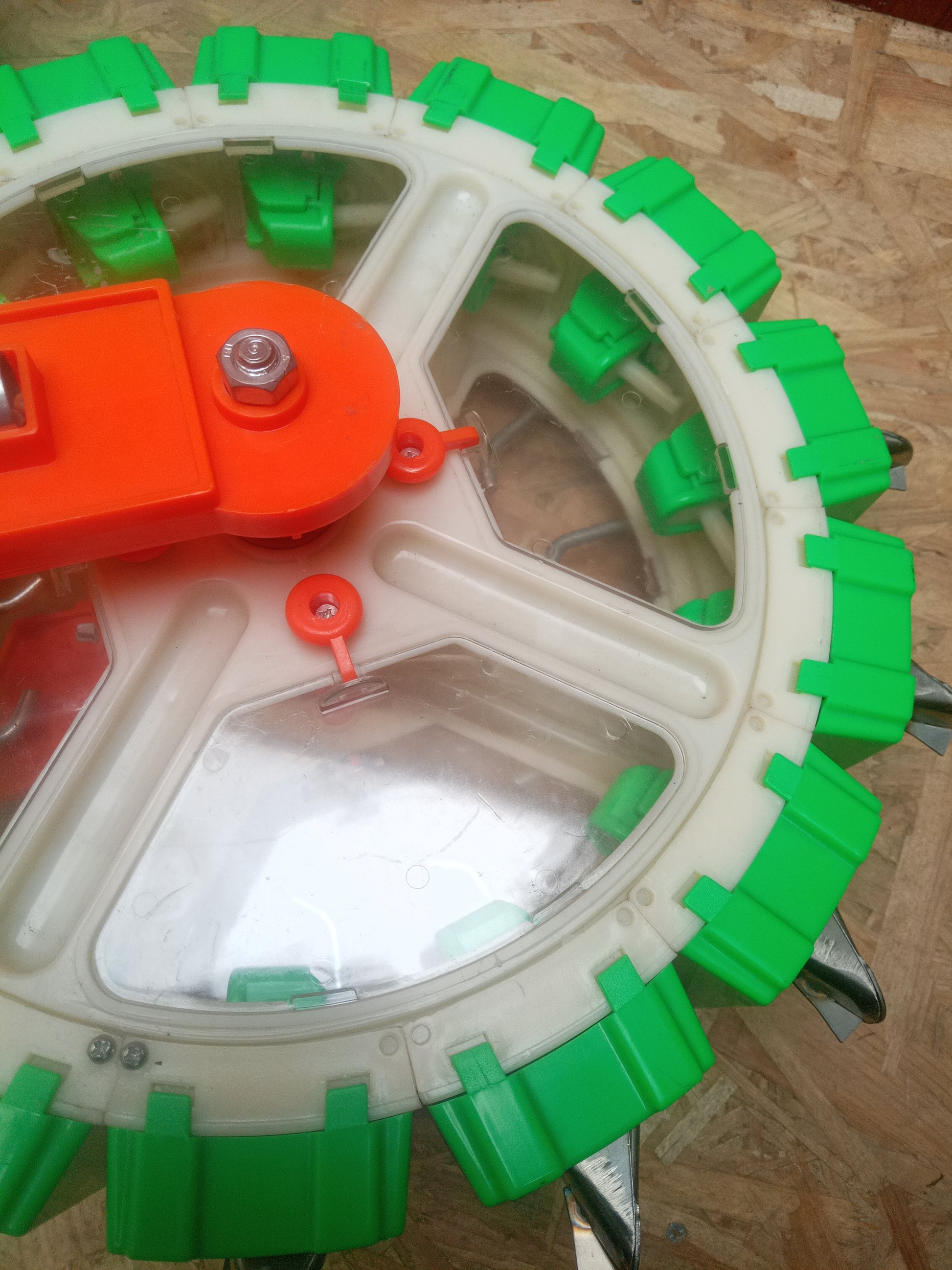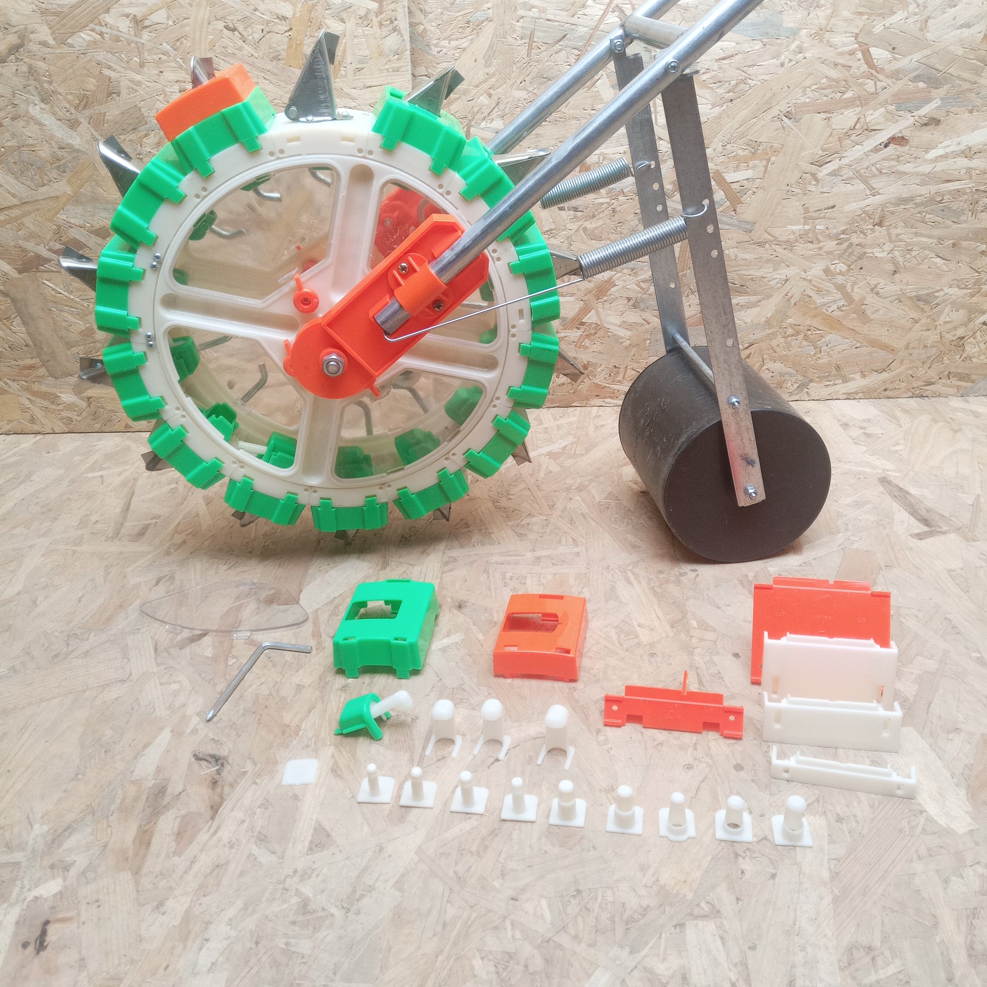 C'est un système à cuillère très simple à changer, avec des systèmes de clips et glissière. Elle est livrée avec 14 tailles de cuillères différentes et des bouchons qui peuvent empêcher les graines de descendre dans certains becs afin de réduire la densité sur le rang.